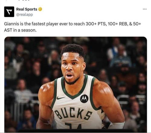 此戰(zhàn),字母哥還創(chuàng)下了NBA歷史第1的神跡。字母哥本賽季9場(chǎng)比賽已經(jīng)得到至少300分100籃板50助攻,NBA歷史最快。